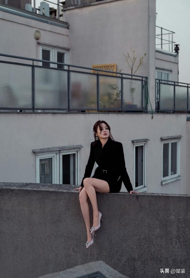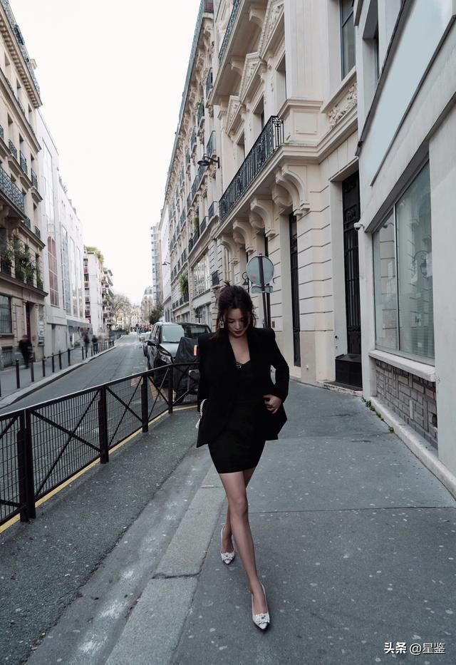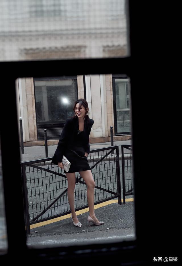 她这套核心是黑西装+缎面吊带裙的叠穿,把硬朗和柔媚平衡得刚刚好。oversize黑西装选了无明显肩线的版型,不会显壮还能藏住手臂赘肉,内搭的缎面吊带裙用亮面材质中和了西装的沉闷,领口的碎钻细节悄悄提亮,不用额外戴项链也足够精致。下装是同色系短裙,刚好露出一截小腿,搭配裸粉色水钻高跟鞋,视觉上把腿拉得又细又长,还不会像全黑那样太沉闷。